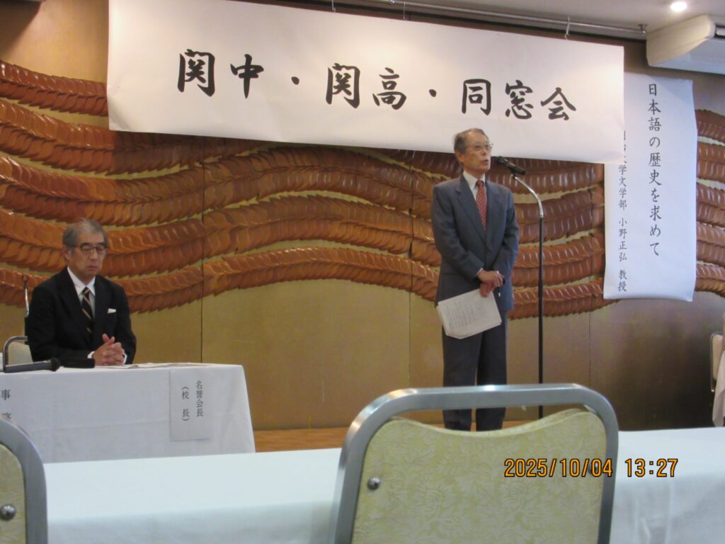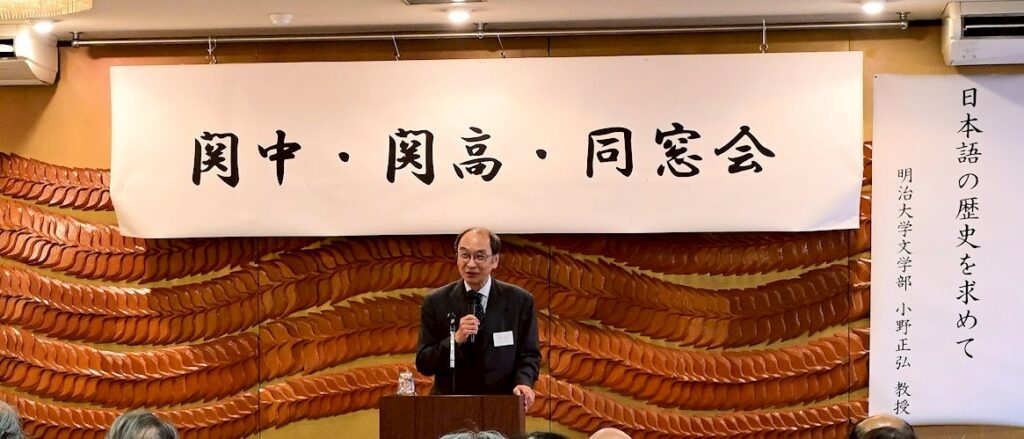 今回の総会では、在京関中一高会幹事でもある明治大学文学部教授の小野正弘氏による講演が行われました。小野氏は日本語学、特にオノマトペ研究の第一人者として知られ、『日本語 オノマトペ辞典』(小学館)、『オノマトペがあるから日本語は楽しい』(平凡社)など多数の著書があります。